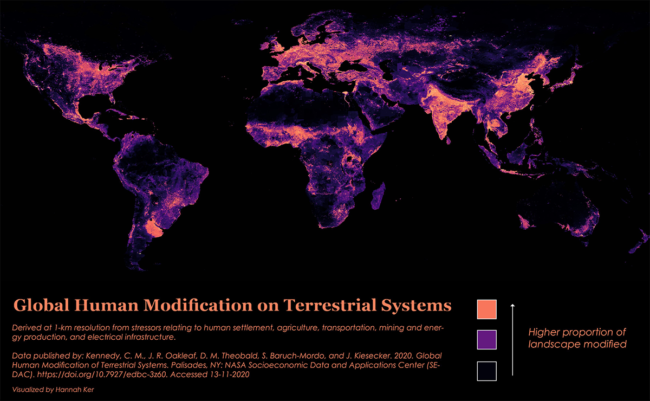 Non c’è dubbio che l’attività umana abbia avuto un impatto sulla Terra, ma fino a che punto? A quanto pare, quasi il 95% della superficie terrestre mostra una qualche forma di modificazione umana, con l’ 85% che porta prove di molteplici forme di impatto umano. Questa mappa della scienziata dei dati Hannah Ker delinea l’entità della modifica dell’umanità sugli ecosistemi terrestri terrestri.
