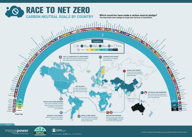 Il tempo per parlare di zero gol netti si sta esaurendo e il tempo per metterli in atto è ben avviato. Al vertice sul clima degli Stati Uniti nell’aprile 2021, il presidente degli Stati Uniti Biden ha fatto pressione sui paesi per accelerare gli impegni neutrali in termini di emissioni di carbonio o impegnarsi in primo luogo nei loro confronti. È il seguito dell’accordo di Parigi, che mantiene i firmatari impegnati a raggiungere la neutralità del carbonio nelle emissioni nella seconda metà del 21 ° secolo. Ma il 2050-2100 è un periodo di tempo ampio, e il cambiamento climatico sta diventando sempre più presente e più terribile. Quando i paesi si sono impegnati a raggiungere zero emissioni nette di carbonio e quanto è serio il loro impegno? Questa infografica del National Public Utility Council mette in evidenza gli impegni neutrali in termini di carbonio al mondo.