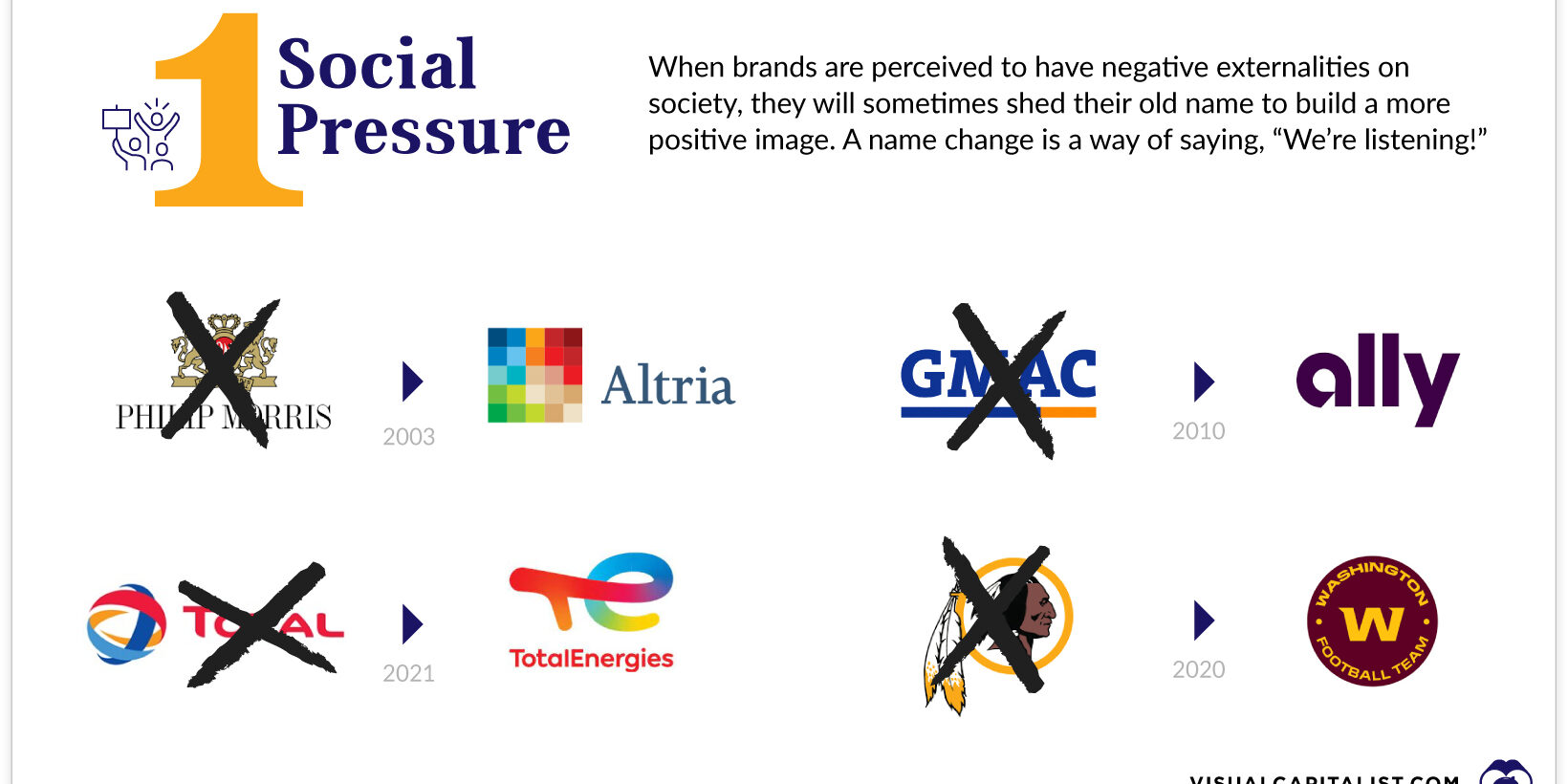 Con il passare del tempo, le società con esternalità negative più palesi sono state sottoposte a pressioni, in particolare nell’era degli investimenti ESG. La pressione sociale era dietro i cambi di nome di Total e Philip Morris. Nel primo caso, il passaggio a TotalEnergies aveva lo scopo di segnalare il passaggio dell’azienda oltre il petrolio e il gas per includere le energie rinnovabili.