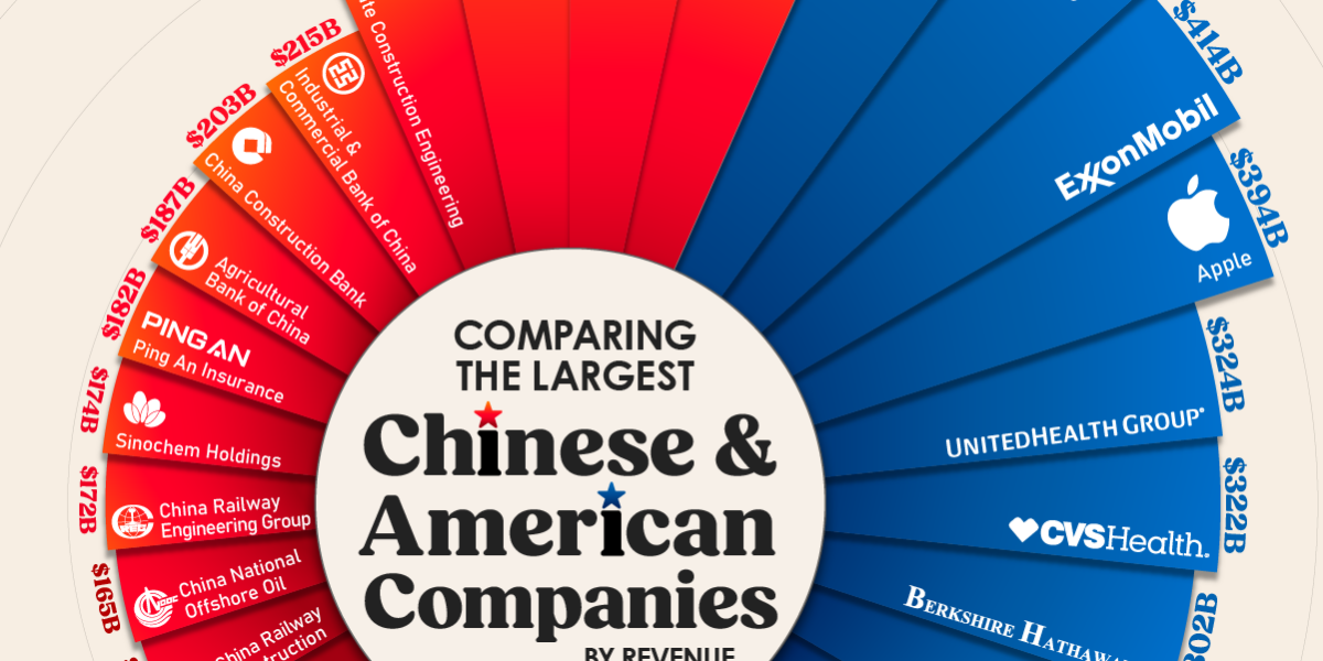 In questo grafico, confrontiamo le 15 maggiori aziende cinesi e americane in base alle loro entrate del 2022, utilizzando i dati del Fortuna Cina 500 e Fortune Global 500.