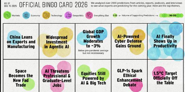 Mappando dove queste previsioni si sovrappongono, abbiamo distillato il rumore in 25 temi di grande convinzione mostrati nel nostro formato “Bingo Card”, con il numero di tabb che riflette il volume delle previsioni di supporto.