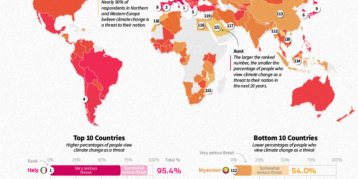 Si sono chiesti se il cambiamento climatico minaccerà, in qualche modo minaccerà, o non minaccerà la loro nazione nei prossimi 20 anni. Queste nazioni sono state classificate in base al numero totale di intervistati che vedono il cambiamento climatico come una minaccia, in qualche modo o meno.