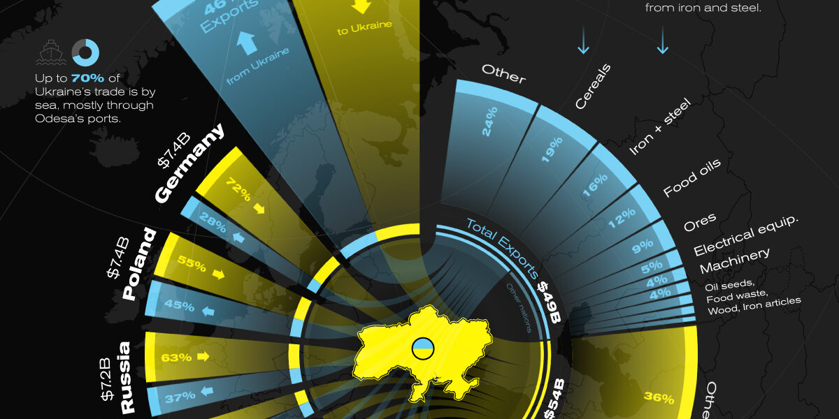 L’attuale conflitto continua a rimodellare le relazioni geopolitiche e il commercio internazionale e per dare un contesto alla situazione, abbiamo creato questo grafico utilizzando i dati del FMI e di UN Comtrade per mostrare i maggiori partner commerciali e le merci scambiate dell’Ucraina nel 2020.