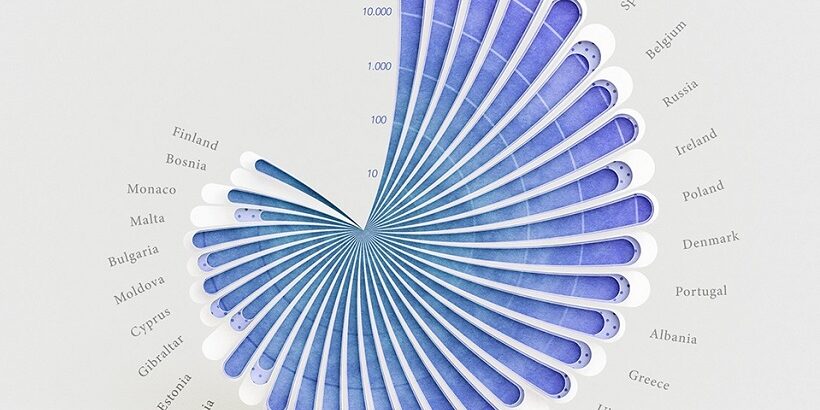 Qui sotto serie di visualizzazioni di Florent Lavergne, possiamo vedere come l’innalzamento del livello del mare potrebbe avere un impatto sui paesi in termini di rischio di alluvione entro l’anno 2100.