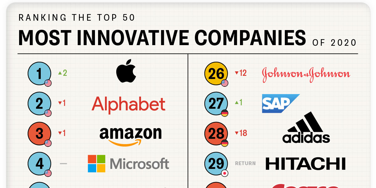 Utilizzando i dati della classifica annuale effettuata da Boston Consulting Group (BCG) utilizzando un sondaggio di 1.600 professionisti dell’innovazione globale, questo grafico classifica le prime 50 aziende più innovative nel 2021.