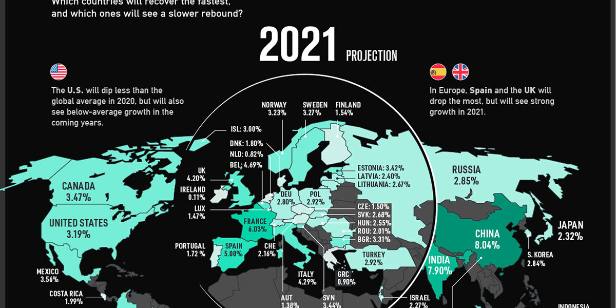 L’Organizzazione per la cooperazione e lo sviluppo economico (OCSE) proietta che dopo un calo del 4,2% quest’anno, l’economia globale raggiungerà i livelli pre-pandemia nel 2021. Questa animazione, che utilizza i dati dell’Ocse, mostra quali paesi recupereranno i più veloci dalla recessione globale nel 2020.
