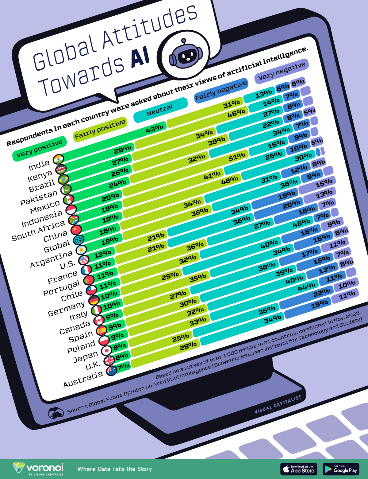 Come 21 paesi vedono l’intelligenza artificiale Punti chiave Tra i 21 paesi presi in esame…