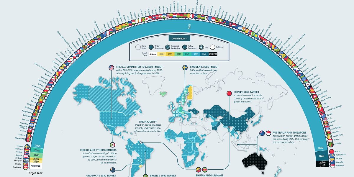 Quando i paesi si sono impegnati a raggiungere zero emissioni nette di carbonio e quanto è serio il loro impegno? Questa infografica del National Public Utility Council mette in evidenza gli impegni neutrali in termini di carbonio al mondo.