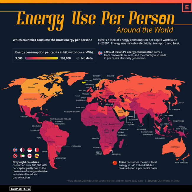 Quindi, quali paesi consumano più energia pro capite oggi?L’infografica di cui sopra mappa il consumo energetico pro capite globale nel 2020 utilizzando i dati di Our World in Data . Il consumo di energia include elettricità, trasporti e riscaldamento.